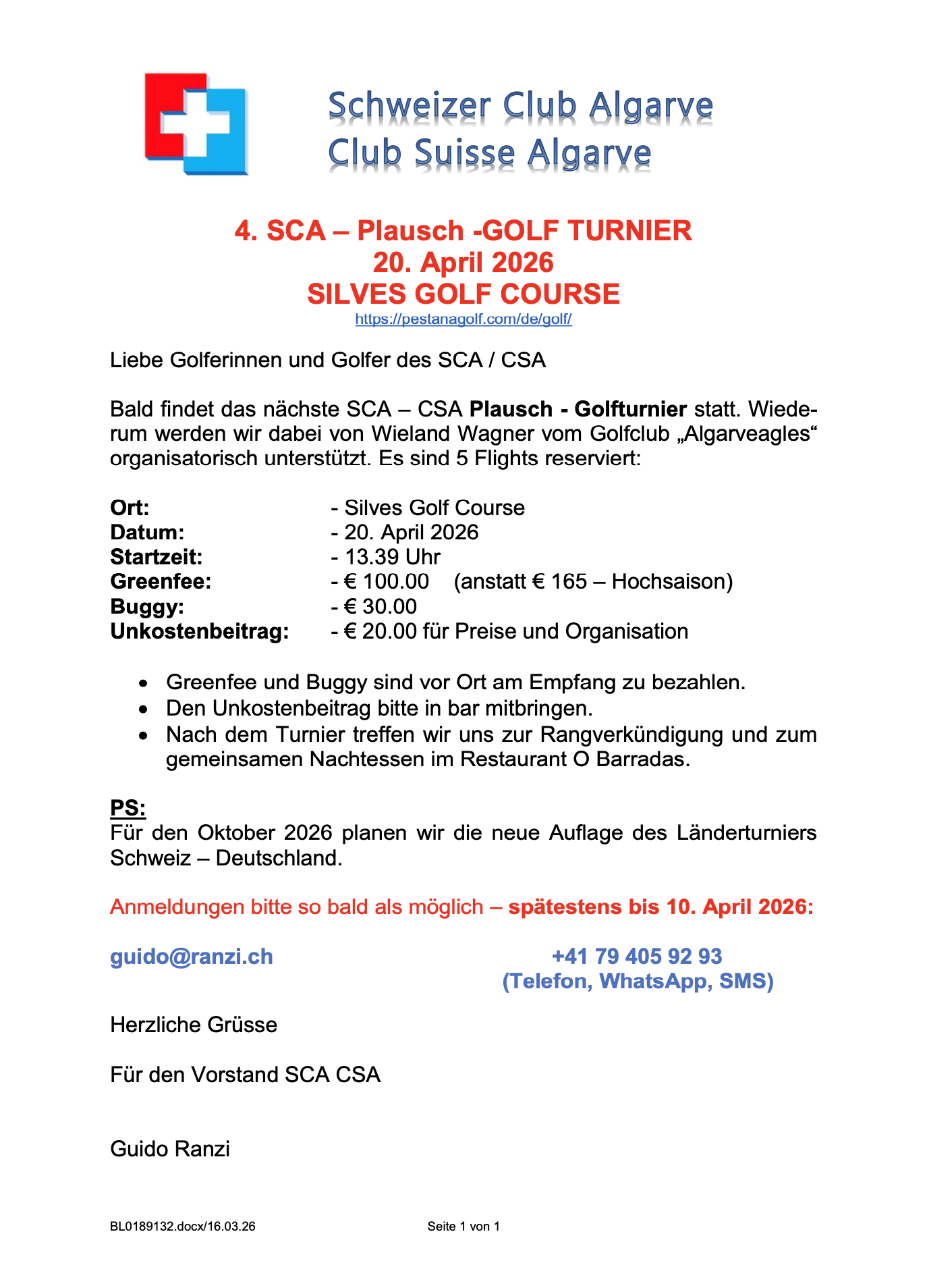 | Oktober 2026 | SCA-Golf-Turnier zwischen dem Schweizer Club Algarve und dem Deutschen Club Algarve |